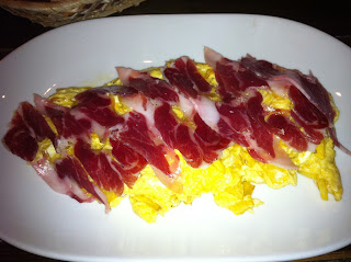 Este plato es el que más me gustó, ya que el revuelto estaba muy pero que muy jugoso y acompañarlo con el jamón hace que sea una buena combinación, mira que simple, huevo, patatas y jamón y un plato de 10.