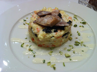 Típica ensaladilla con lascas de ventresca y queso camembert, jugosa, y el queso no enmascaraba el sabor del resto de ingredientes.