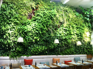 El lugar un privilegio, con madera, tonos cálidos y con un jardín vertical (de verdad) que te hace sentir en contacto con plena naturaleza. Nos tocó la mesa que se ve en la foto, toda una suerte.