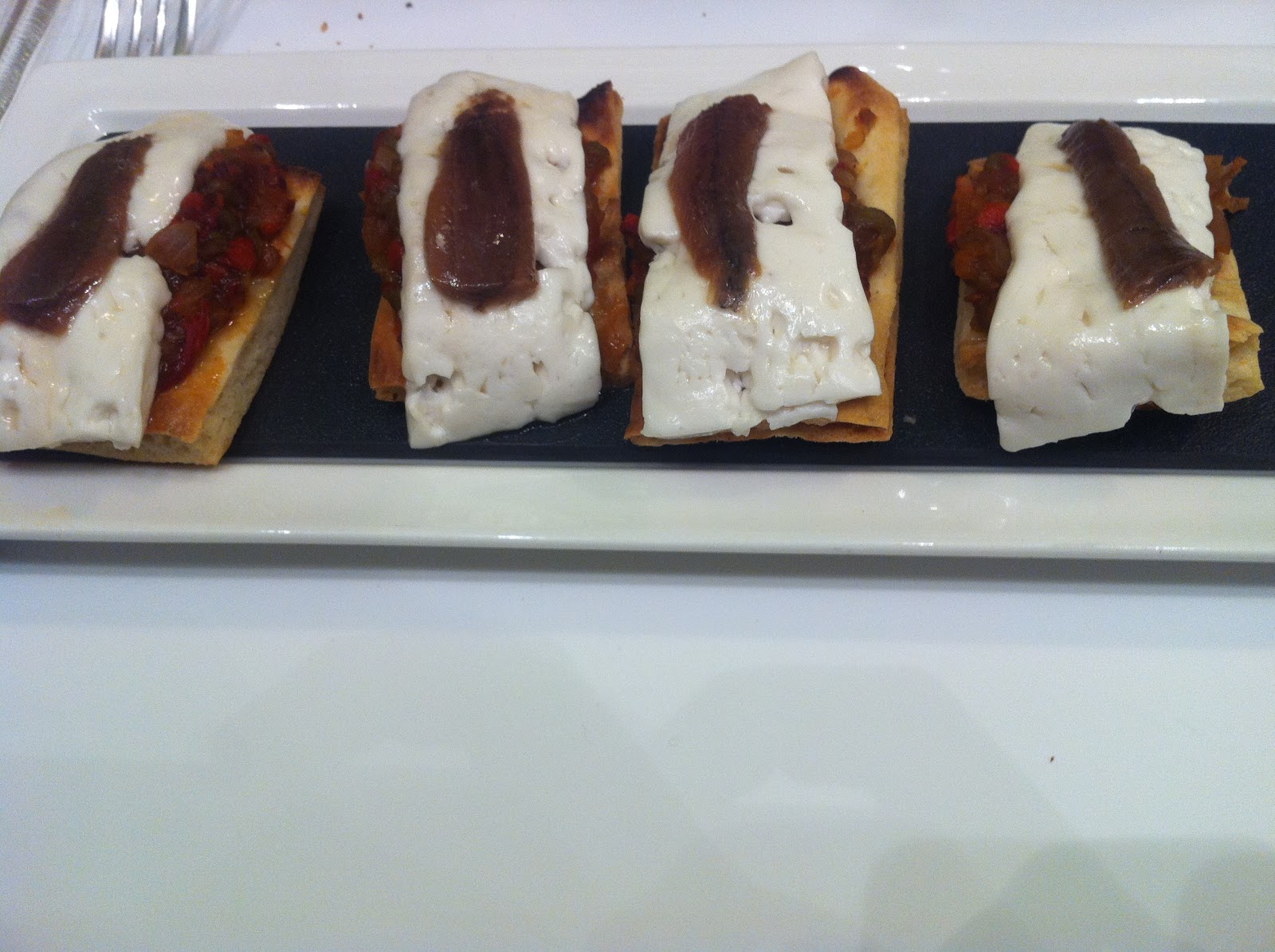 Acompañada de queso fresco de cabra. La combinación de anchoas y queso fresco es muy buena, se complementan muy bien el sabor fuerte e intenso con la suavidad del queso.