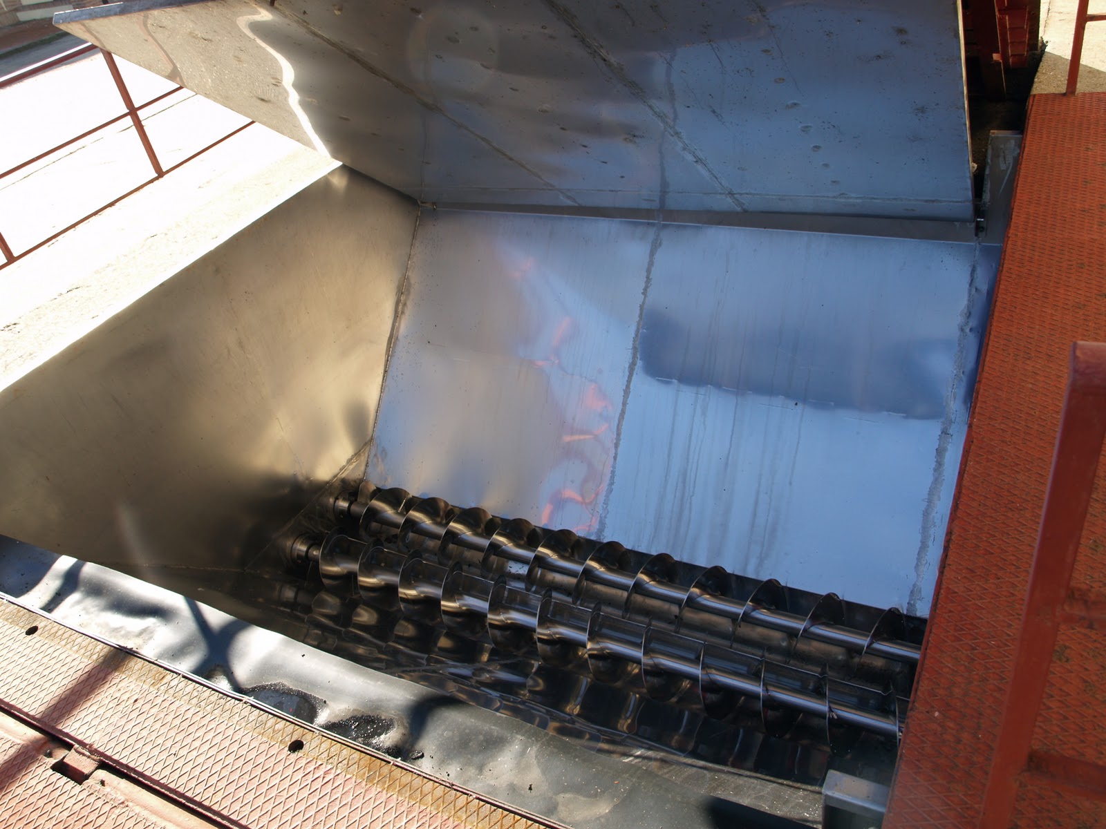 En esta máquina con sinfín, recepcionan los tractores y camiones todas las uvas y de aqui se pasa al interior donde hay una despalilladora que lo que hace es que lo bueno de la uva vaya directamente a los depósitos de acero inoxidable.