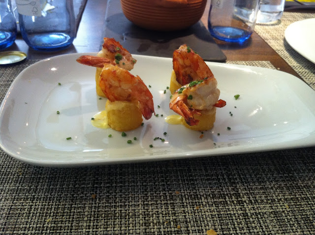 Continuando con el festival de la risa por no llorar, Celia se pidió unos langostinos tigre con alioli de azafrán y rúcula...¿la rúcula?, yo los probé y me gustaron, aunque escasa ración, eran 4 dados. Los platos se nos seguían acumulando.