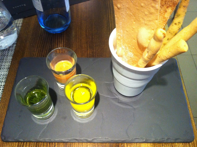Tomen asientos que empezamos. Como aperitivo nos trajeron diferentes panes, pan de regaña y palitos con semillas, todos ellos sobre una falsa pizarra y acompañados de 3 vasitos para mojarlos. Si no me equivoco, el verde era de aceite con perejil y ajo, el rojo salmorejo y el amarillo aceite con queso. Muy buenos aunque el del queso costaba reconocerlo. Me parece correcto este tipo de aperitivo, como el otro día en El Abrazo de Vergara. Hoy en día la gente ya no entiende pedir algo de aperitivo y que le traigan unas patatas fritas.