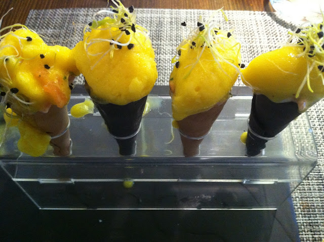 Conos de salmón, crema agria y sorbete de naranja. Un poco complicados de comer y el contraste era bastante fuerte, tanto de sabor como de temperatura (escasísimo salmón). Si os fijáis en la foto, chorreaba el helado, de hecho 2 de ellos los trajeron con el helado caido...nos sorprendió cuanto menos, yo no soy de quejarme y menos por estas cosas, pero ¡un poco de cuidado!, se lo comentamos al camarero y nos respondió "colocádlo vosotros".