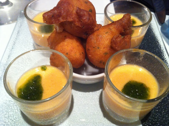 Nos sentamos a la mesa, unas botellas de vino de Rueda y ¡toma ya! un aperitivo de lo más sabroso. Buñuelos de bacalao y salmorejos. Rico rico como diría Arguiñano. Debe ser especialidad de alli porque los buñuelos estaban cojonudricos, ricos!!