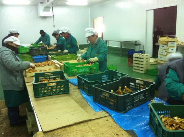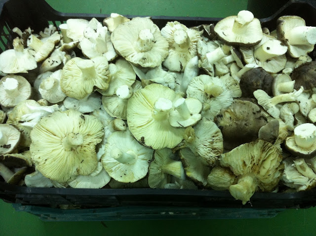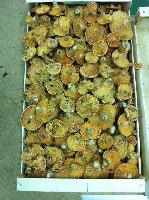 Me sorprendió lo ordenado y clasificado que lo tienen y la pulcritud que alli se percibe. Cajas como estas se apilaban perfectamente ordenadas por clases. Aqui unos níscalos coloridos y hermosos. Se ve perfectamente el himenio, esas láminas que conforman el sombrero.