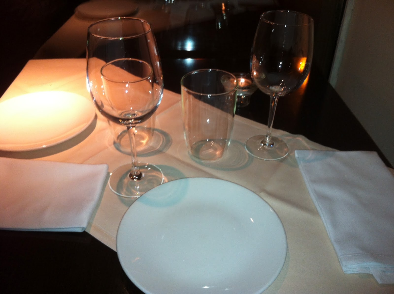 A la mesa ausencia de decoración, como a mi me gusta. Un plato, una servilleta, cubiertos y una copa, punto pelota. La decoración tiene que venir por parte de la comida.