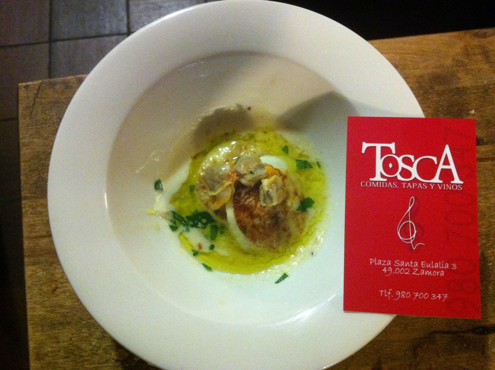 Después en La Tosca (32), lleno hasta la bandera (eso es bueno), nos sorprendieron con su "tosquita", que contenía rulo de queso de cabra caliente y por encima berberechos.