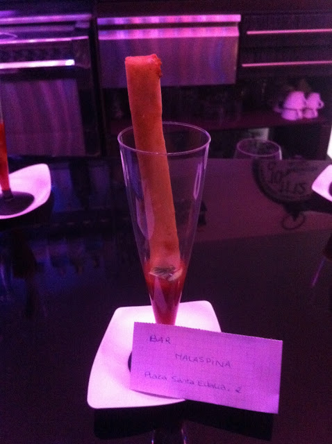 Momento de dejar de tomar vinos, que entre la emoción de estar en mi Zamora Tierra Querida y el cansancio del día, la combinación podía ser peligrosa. Un agua en Malaspina (15), y su tapa "cigarrito de mezclum de quesos". Un rollito de quesos caliente dentro de una copa de salsa de chile y menta.