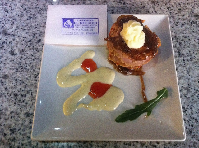 De camino al río, nos pillaba en ruta El Refugio (34) su tapa "milhojas de carne" estaba hecho de eso, milhojas de carne, con una salsa de pimiento rojo, salsa de champiñones y por encima de las milhojas, puré de patata, cebolla y beicon.