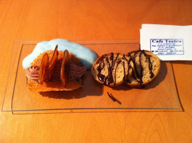En Café Teatro (38), su tapa "tierra y mar" estaba hecha de muchas cosas y con un guión estipulado para comerla. Una teja hecha de jamón serrado y queso, sobre ella paté que había que untar, después una espuma cortante que sabía a limón y ron, por otro lado pan de agua de mar, y para acabar, unas cortezas de pera. Vamos que de aqui sales cenado.