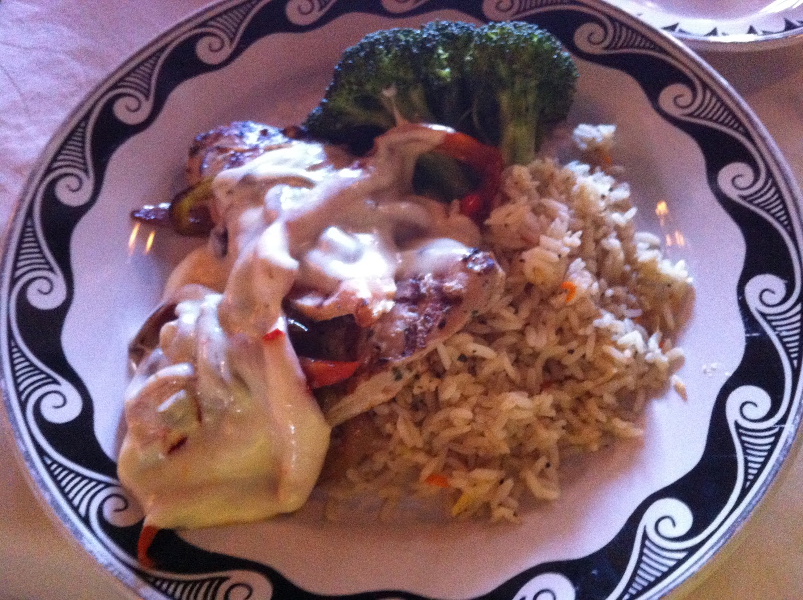 De segundo pollo con arroz y queso. Nada del otro mundo, aunque me gustó la combinación de pimiento rojo y queso fundido sobre el pollo, le da un sabor más dulce.