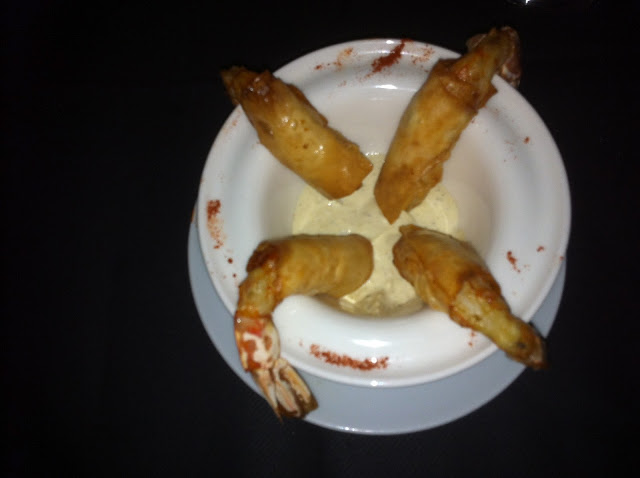 Después de las croquetas de pollo y sepia (no hace falta subir foto), unas gambas crocantes con salsa tártara. No soy aficionado a la salsa tártara pero estaba muy bien hecha y acompañaba muy bien a las gambas.