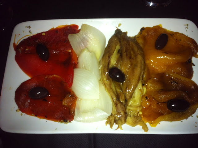De "pica-pica", como lo llaman en Barcelona, nos pedimos una escalivada a la leña, a base de pimiento morrón, cebolla, berenjena y pimiento amarillo acompañado de unas aceitunas. Muy rico aunque un poco soso, eso sí, mejor pecar de eso que tiene fácil remedio.