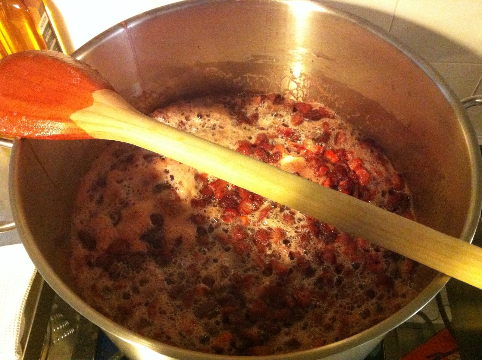 Cazuelas de 9kg que quedan reducidas a nada, ya que la mayoría de las frutas están compuestas por agua. Casi siempre se suelen poner 3 cazuelas a la vez, una vez acabado, se envasa y se pasa al autoclave.