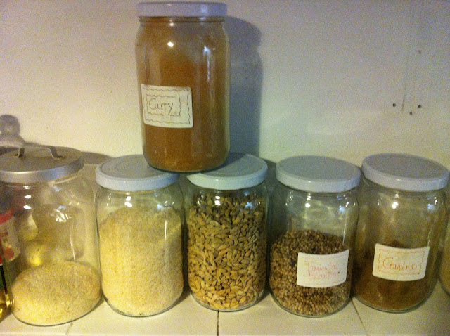 Variedad de tarros con diferentes especias. Comino, pimienta e incluso curry.
