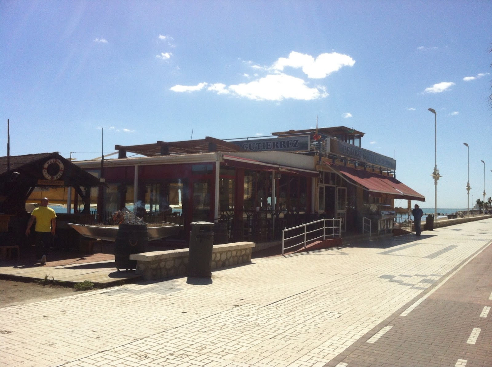 Concretamente fui a Pedro Gutiérrez, más conocido como el chiringuito de los Gutiérrez. Un lugar con vistas al mar...¡un placer comer con el mar de fondo! Cuando iba para allí, me llamó la atención una especie de barca con arena y brasas por encima, ahí es donde se espetan las sardinas o cualquier otro tipo de pescado. Espetar quiere decir...digamos que hacer una brocheta de las mismas mientras se hacen a la brasa.