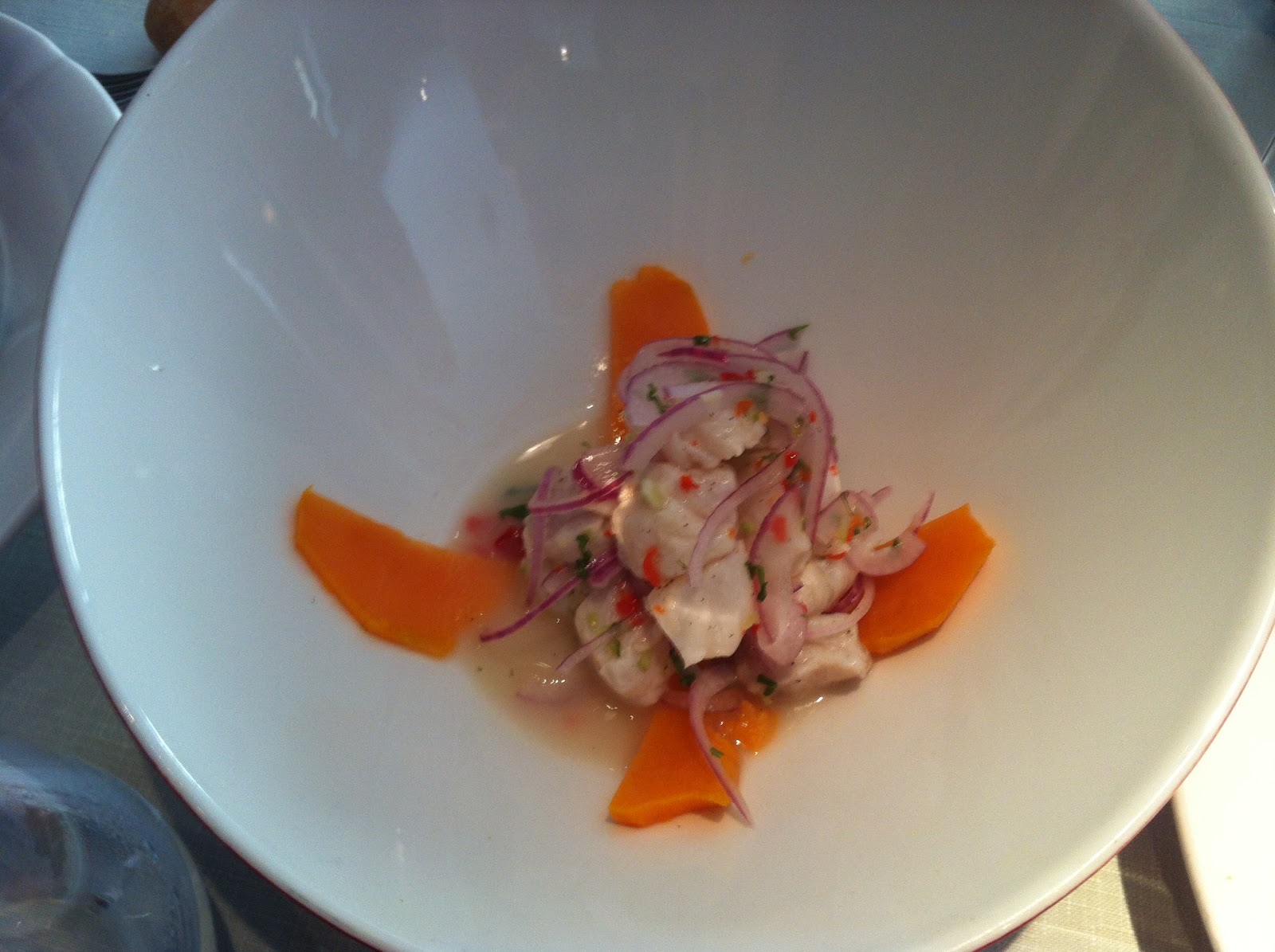 El maitre nos recomendó el ceviche, o cebiche como lo queráis llamar. Al caso, que uno de los cocineros del Ten Con Ten es peruano (porque el resto serán asturianos...¿o eso es en El Paraguas?) y lo hace muy bueno. Buen ceviche, muy especiado como debe ser y con buena textura.