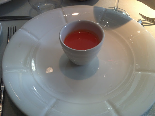 Gazpacho de fresa, mu-y-bi-en-he-cho. Aromático.