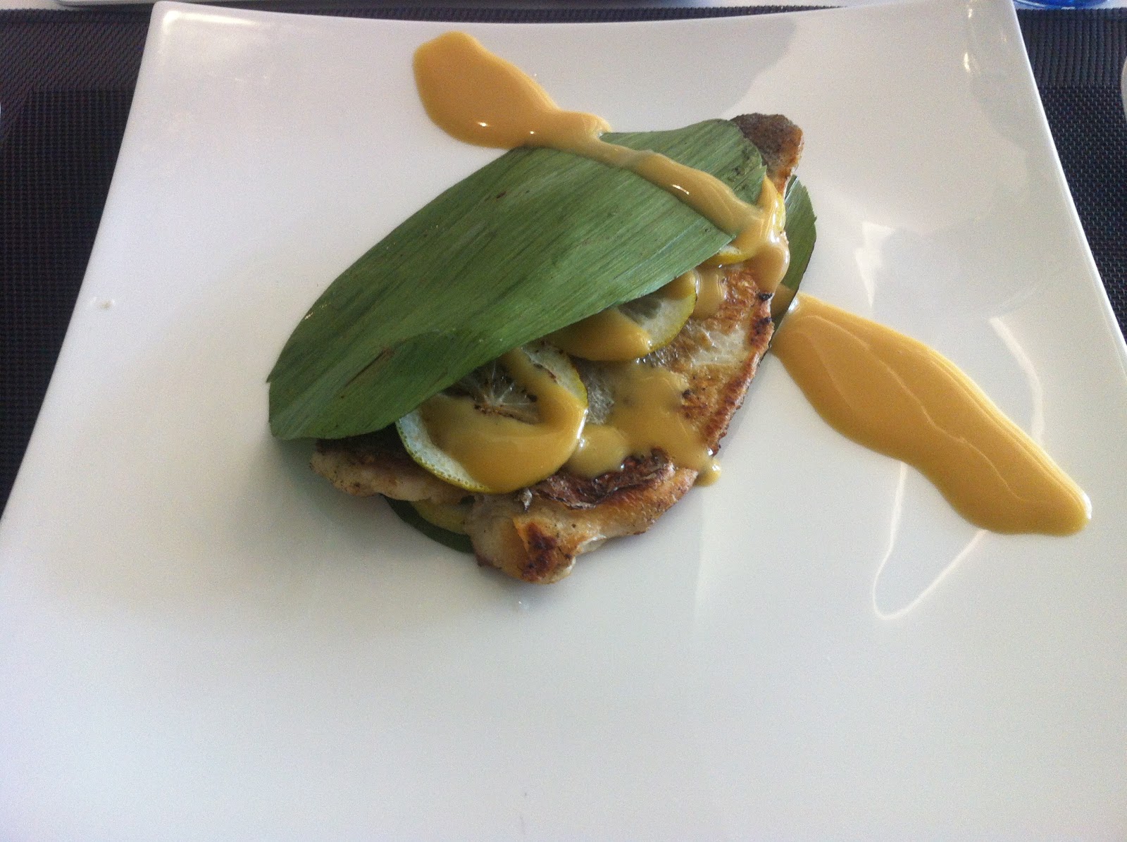 Lubina asada a la parrilla con cítricos cocinados en hojas de pandan. Crujiente por fuera lo justo y necesario con un toque a limón de lo más sabroso y aromático.