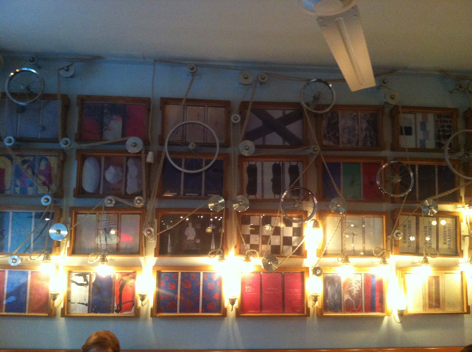 Por dentro me llamó la atención los cuadros/caja sin sentido alguno con sus respectivos focos y un entramado de poleas y ruedas que me recordaron a los juegos de lógica de cuando era pequeño...El ambiente de 20-30 años, gente que llevan en la frente escrito "soy emprendedor" y mesas pequeñas donde degustar unos buenos bocados.
