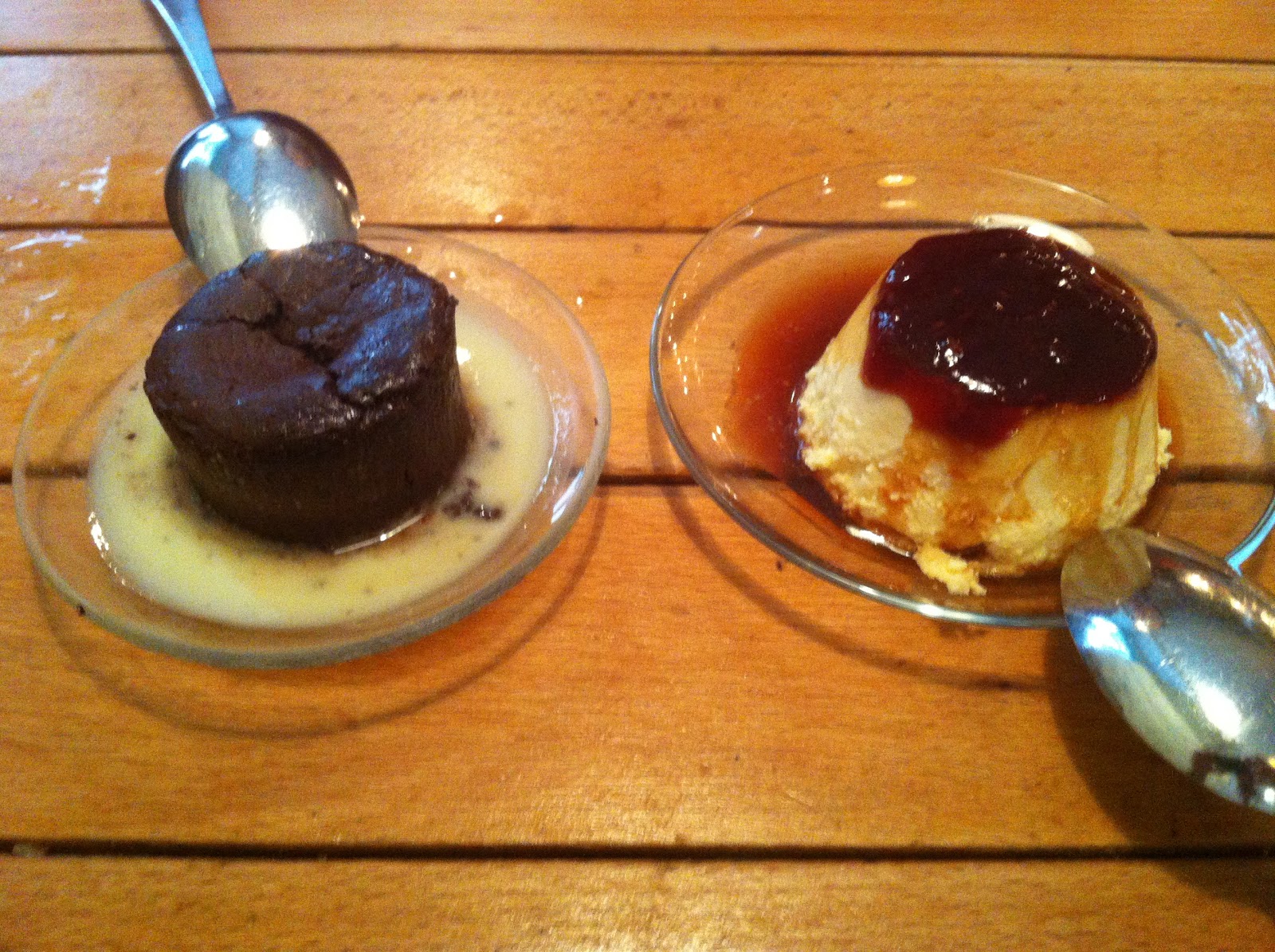 De postre chocolatisimo muy común en restaurantes de Madrid (pero aunque lo tenga muy visto está buenísimo) y cheescake en formato flan, compacto y contundente.