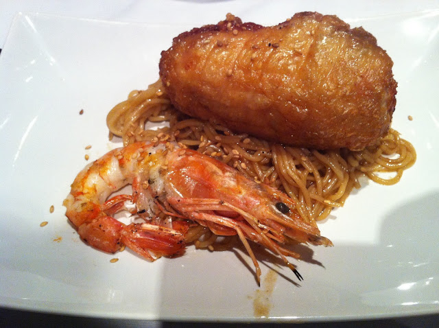Cuando vi este plato me arrepentí de haber pedido pescado. Elena y Miguel pidieron cada uno pollo con langostinos. Yo que soy amante del pollo asado (lo sé, soy fácil de invitar a comer a casa), verlo en ese gran rollito, fritito, crujiente, que desprende sabor, mucho sabor...pues acerté no pidiéndomelo. Lo probé, pero por dentro tenía surimi en formato barritas de cangrejo, por lo que muy bien por fuera, pero mal por dentro, no lo veo yo buena combinación.