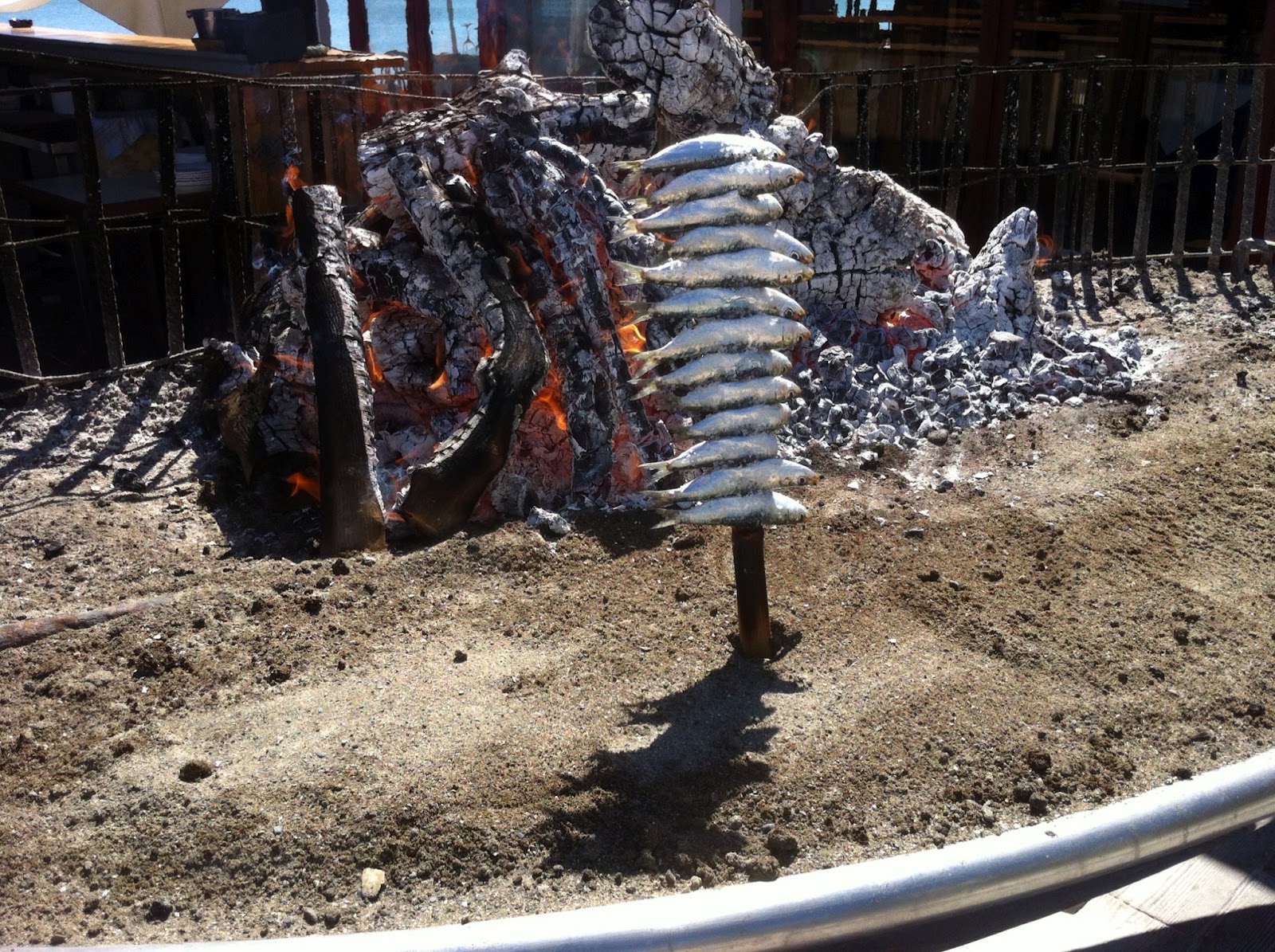 Concretamente fui a Pedro Gutiérrez, más conocido como el chiringuito de los Gutiérrez. Un lugar con vistas al mar...¡un placer comer con el mar de fondo! Cuando iba para allí, me llamó la atención una especie de barca con arena y brasas por encima, ahí es donde se espetan las sardinas o cualquier otro tipo de pescado. Espetar quiere decir...digamos que hacer una brocheta de las mismas mientras se hacen a la brasa.