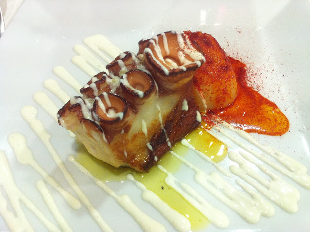 Pulpo a la brasa con patata y ajo blanco. Cuando vi ese tentáculo, se me hicieron los ojos chiribitas, ¡qué pedazo de plato! El pulpo en su punto, no voy a puntualizar nada porque simplemente me gustó mucho.