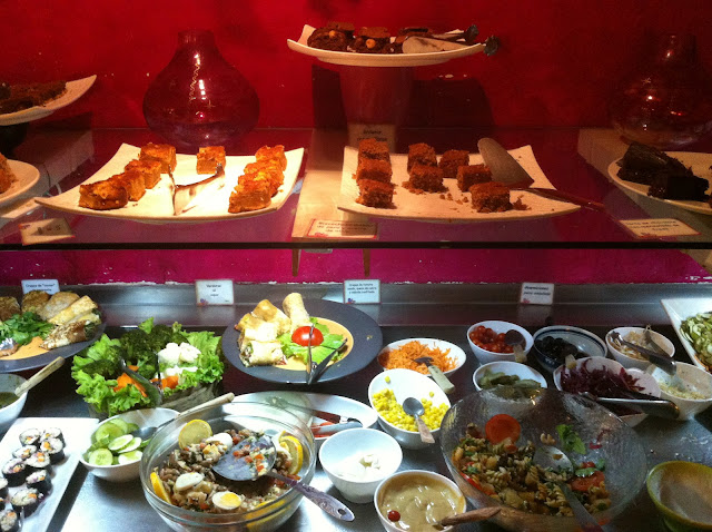 Viva la Vida cuenta con un suculento y variadísimo buffet, en el que tu compañero es un plato vacío. Gran variedad de ensaladas (como no), verduras al horno y postres que son, pero que no son (o no saben, diría yo).