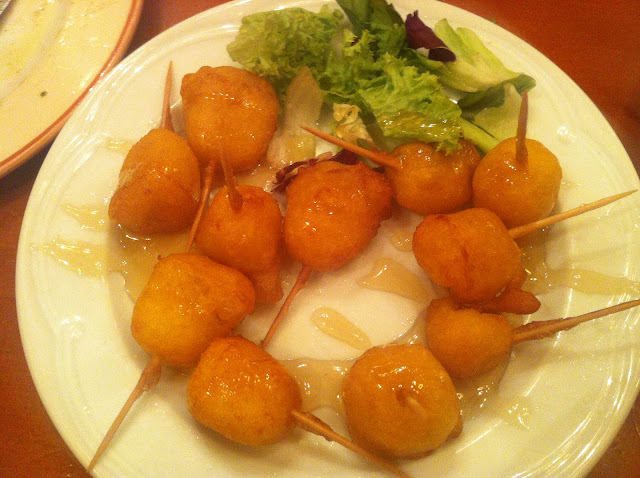 Un salmorejo, un foie de oca y pato con mermelada de tomate, queso frito en tempura (para mi gusto muy pesado tanto por el queso, como por el rebozado, ¡y también por la miel!), rollitos de salmón rellenos de queso y alcaparras (me sobra la lechuga decorativa), solomillo relleno de jamón con piquillos y garrapillas muy top, queso de cabra con pan de nueces y salsa arandanos, exquisito por el queso de cabra vuelta y vuelta, y de postre una tartita de chocolate caliente con helado de vainilla para cambiar el sabor salado.