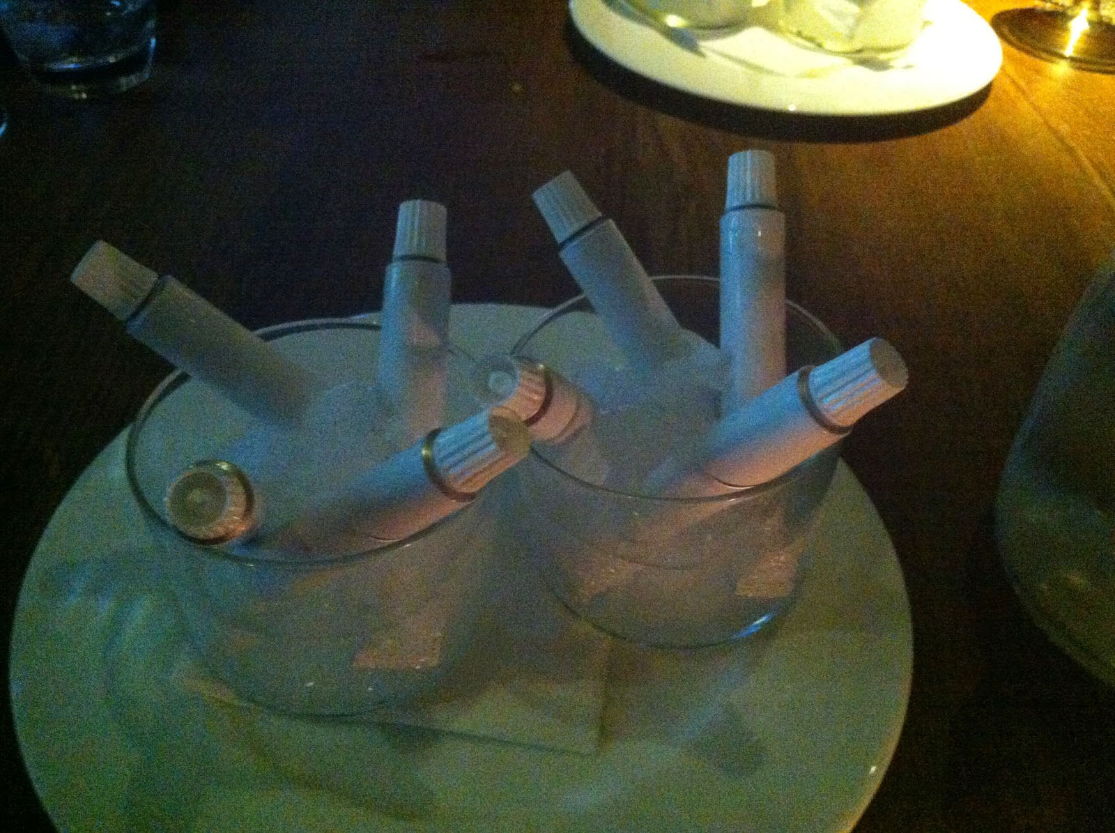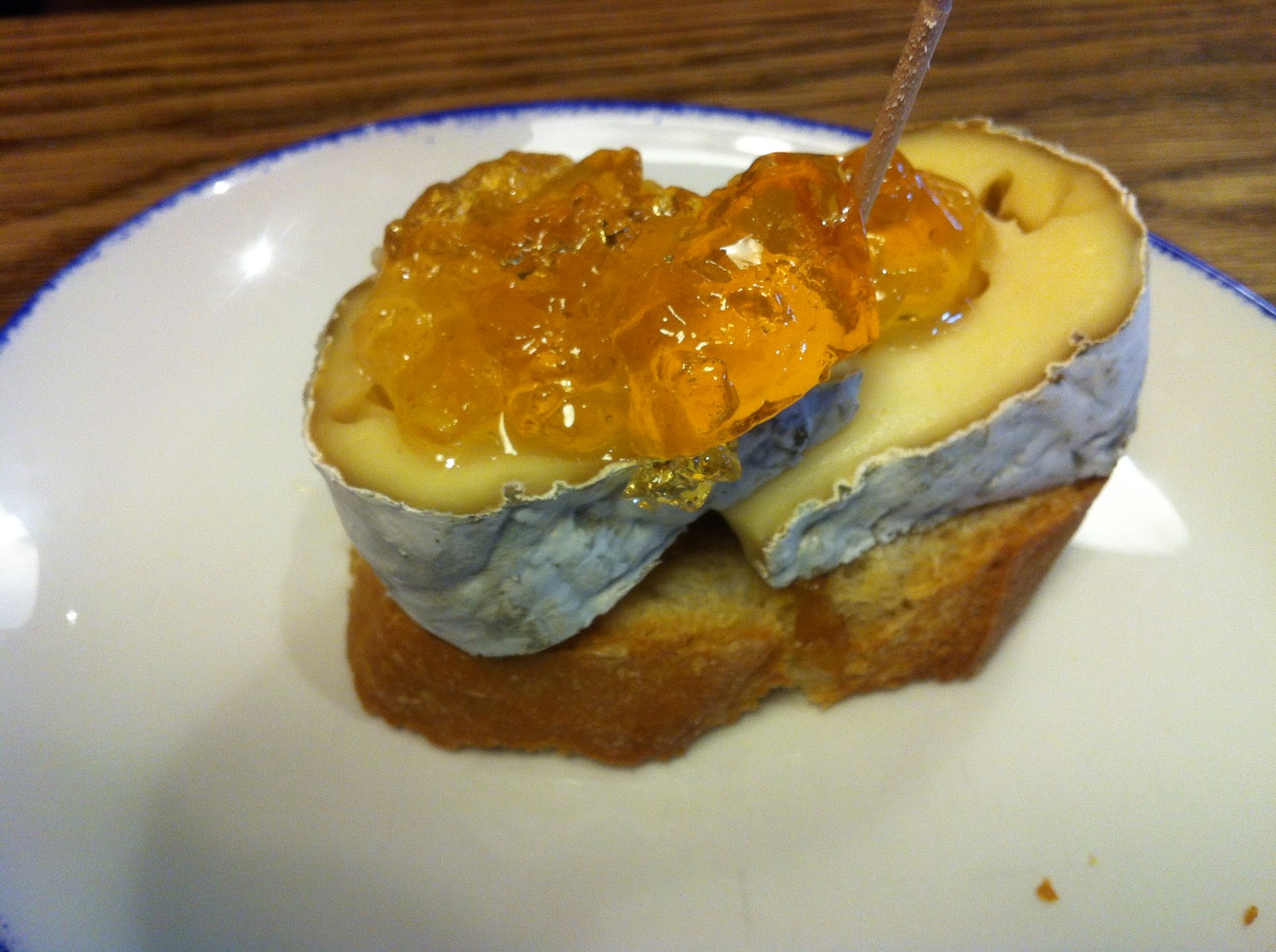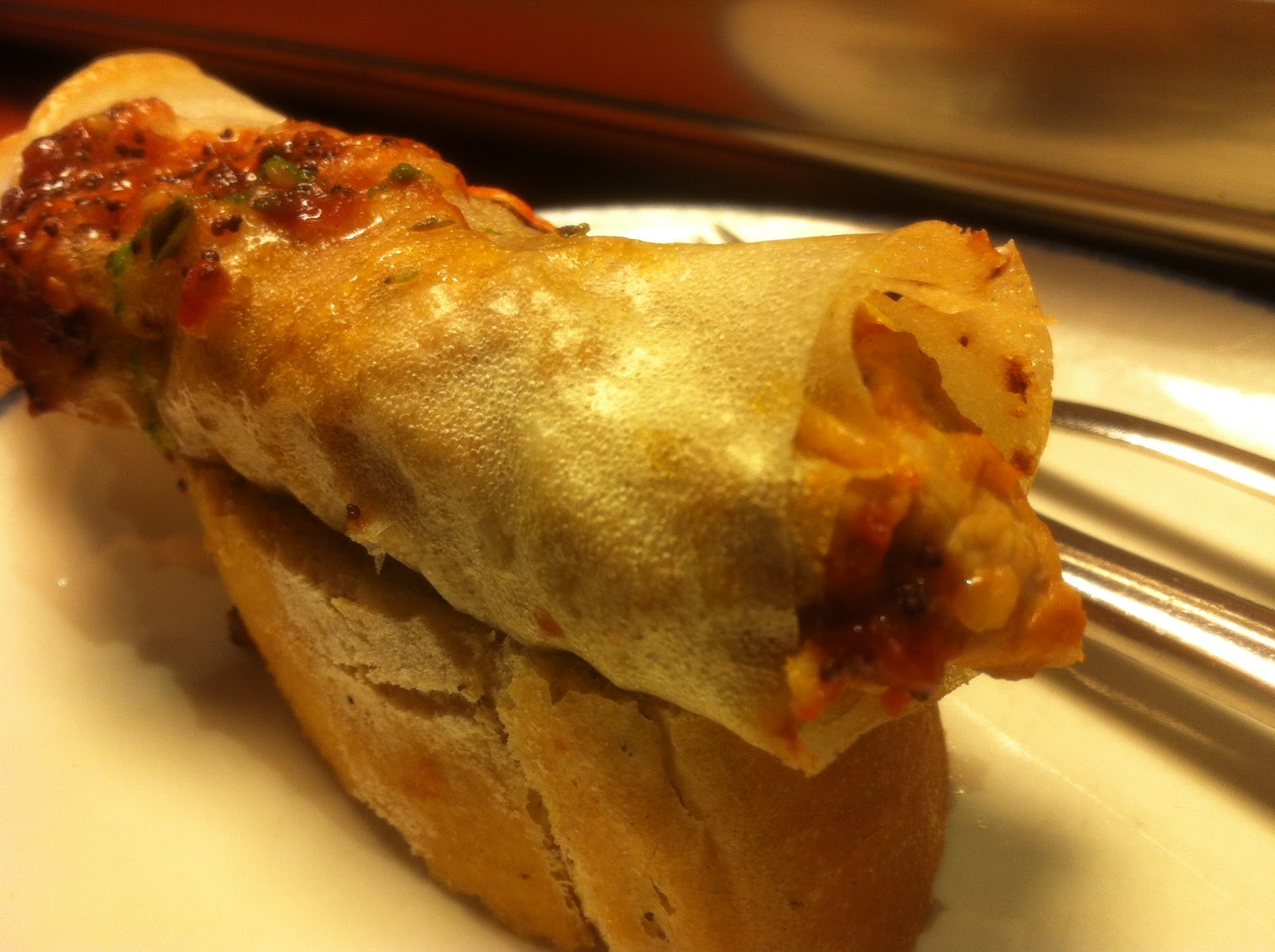 Croquetas en caneco, unos rollitos de pollo y mango y una exquisitez que pasaré a explicar con una foto. Agradecer al jefe por la botella de champán, todo un detalle por su parte.