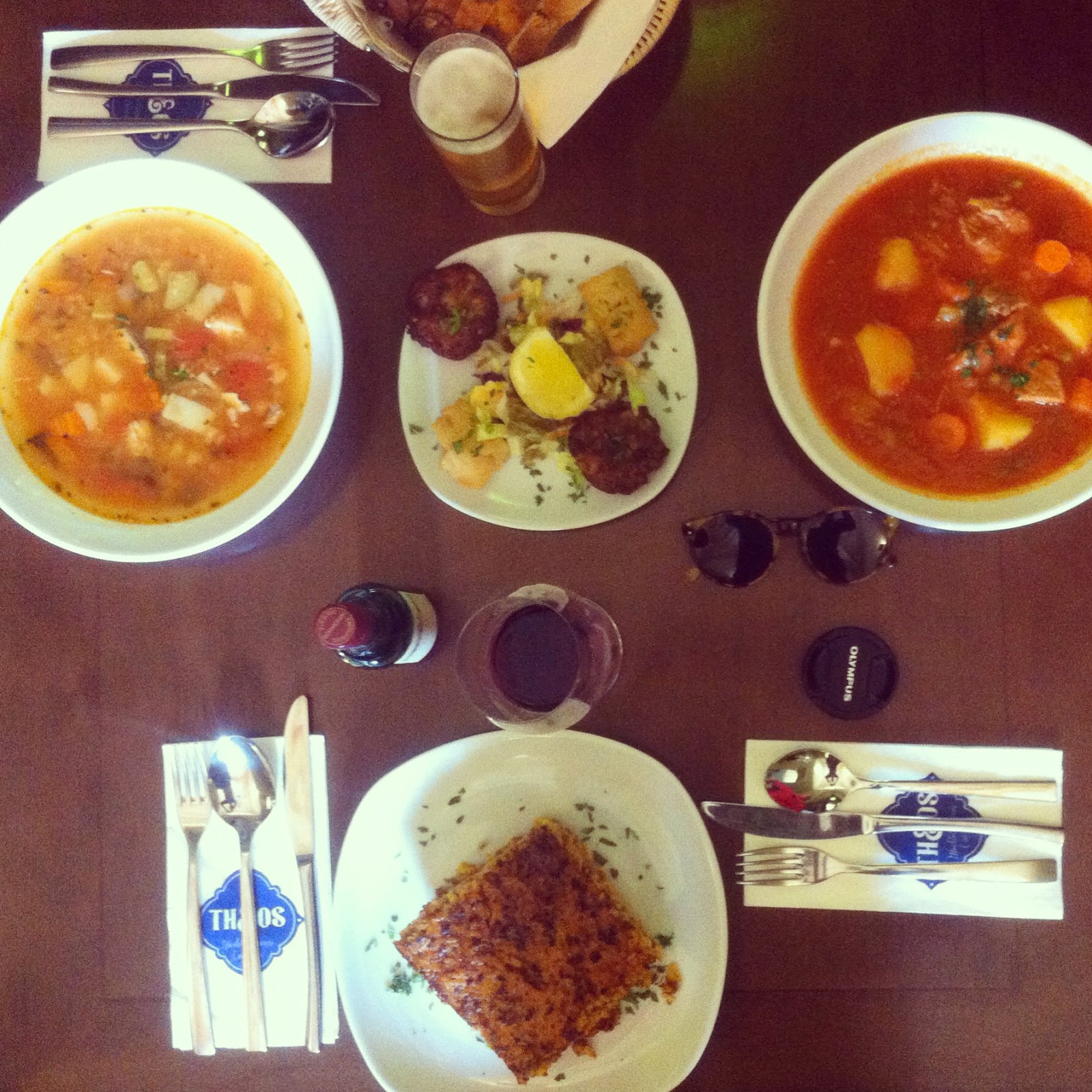 Pastel de arroz muy sabroso aunque seco, sopa de pescado o incluso un guiso de cerdo con patatas con una exquisita salsa hecha a base de tomate. Salí contento de esa comida, parece que los dioses nos habían echado un capote. El sitio se llama Theos.