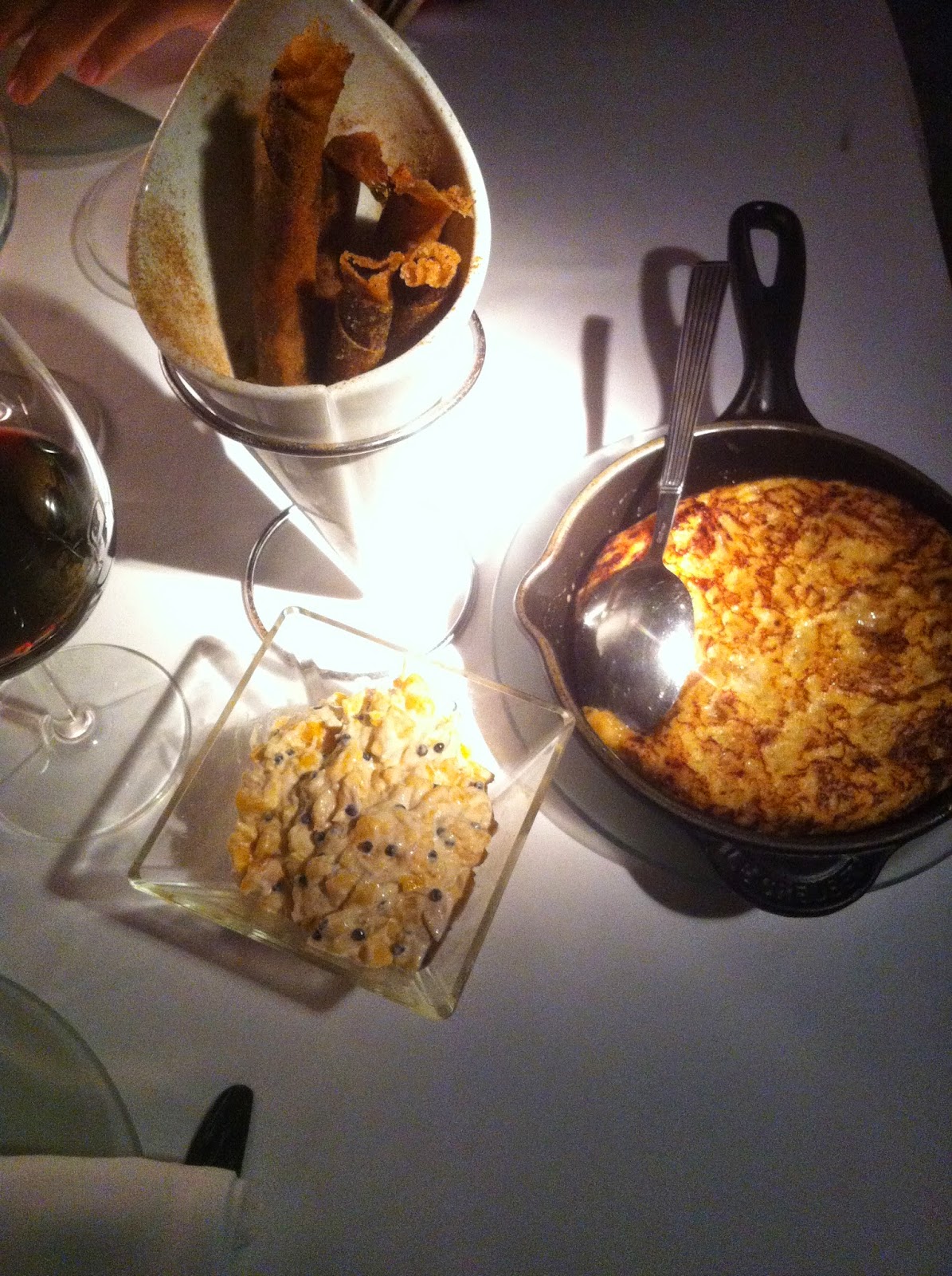 Empezamos degustando una curiosa tortilla de patata (con sartén y todo) aromatizada con aceite de trufa. Con un par de gotas se puede hacer maravillas, ¡es el Chanel Nº5 de la gastronomía!