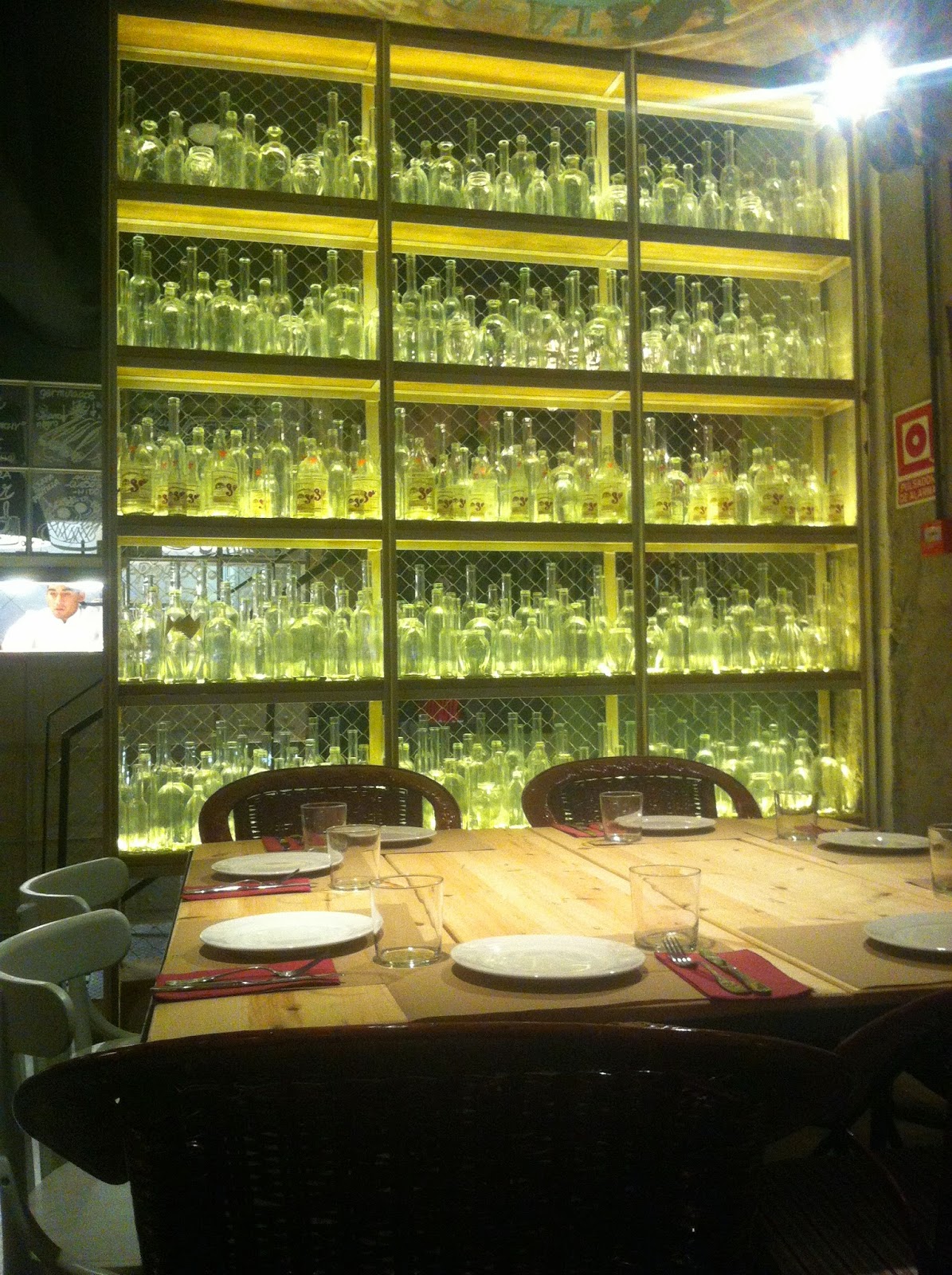 Un sitio que congrega "la vuelta a los orígenes" de los pueblos con mallas de gallinero, mesas macizas de madera y recortes de periódico por las paredes. Muy eco y renovable me pareció todo el interior, y mucho vidrio en las estanterías. Veamos si en la carta hay burrata...¡ay la burrata!