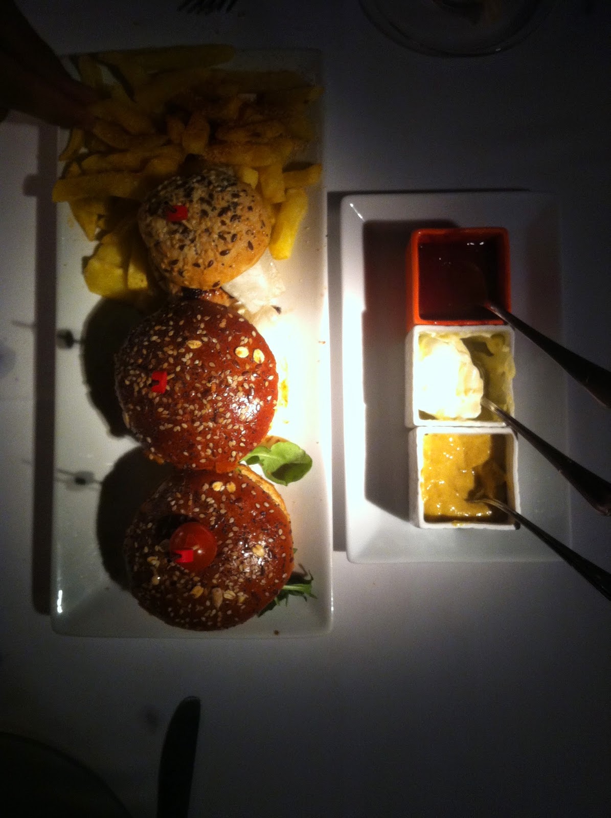 Continuamos con una degustación de mini-hamburguesas. Destacar la de pollo, y sí, la podemos denominar hamburguesa, porque no estaba hecha a base de pechuga, sino que la carne de pollo estaba picada. Muy interesante poner rúcula en la hamburguesa y para mi me sobraron las salsas.