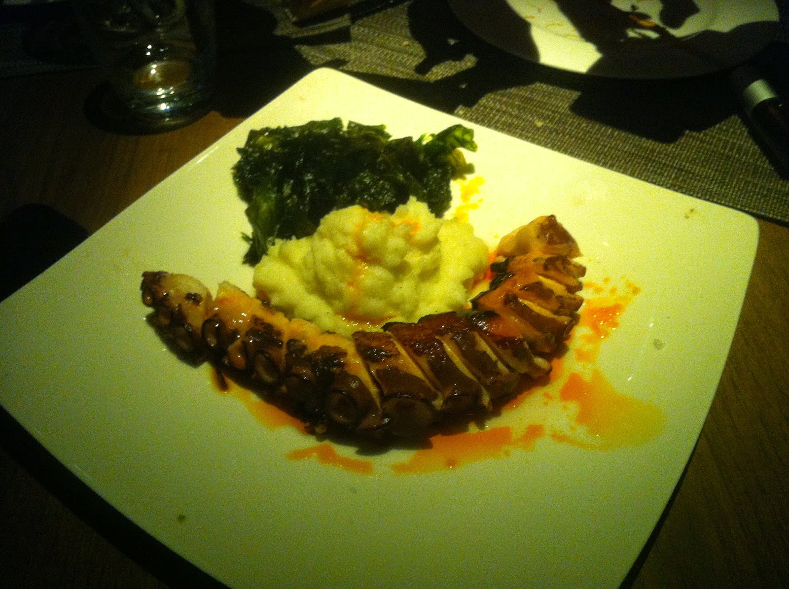 Pulpo con crema de patata y hojas fritas muy crujientes.