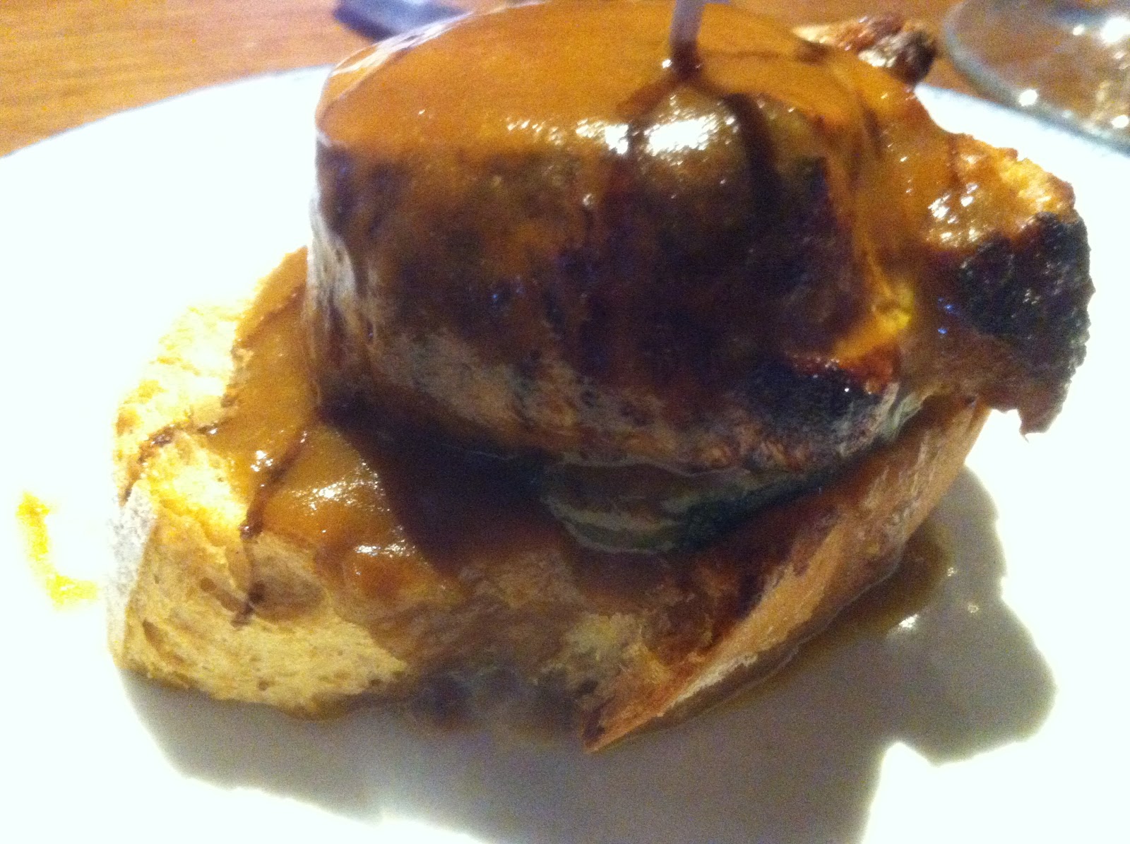 Una base de sobao pasiego, con foie por encima, huevo poché y membrillo, ah y mermelada. Estaba de muerte, lo mejor es destrozarlo, revolverlo y disfrutar. Para mi gusto me sobran los germinados de arriba.