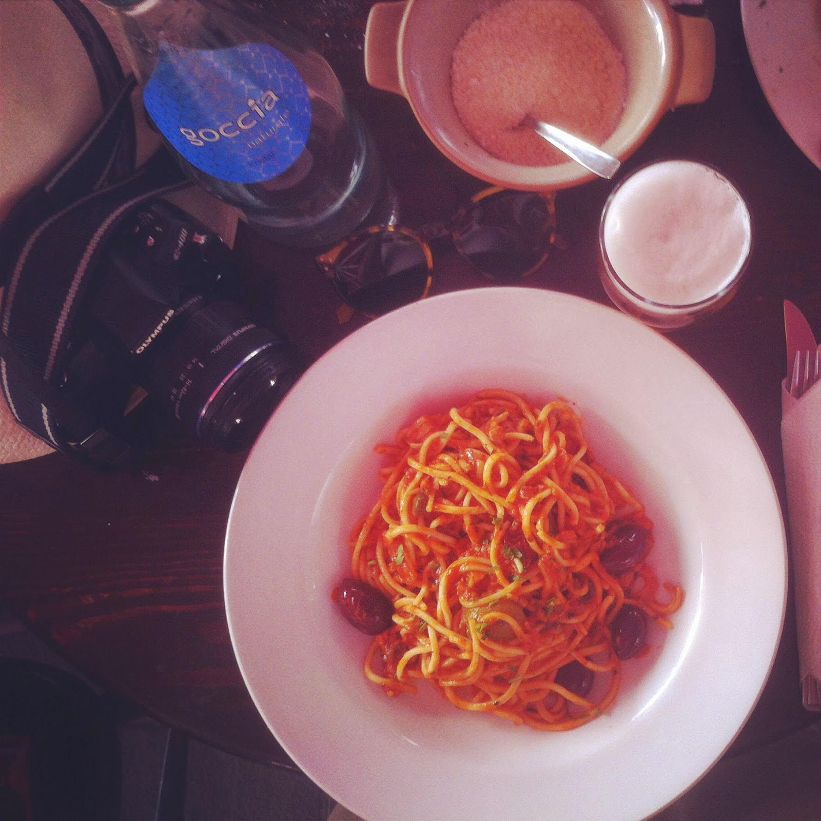 Empezamos a ver influencias de gastronomía italiana. Espaguetis con aceitunas y alcaparras.