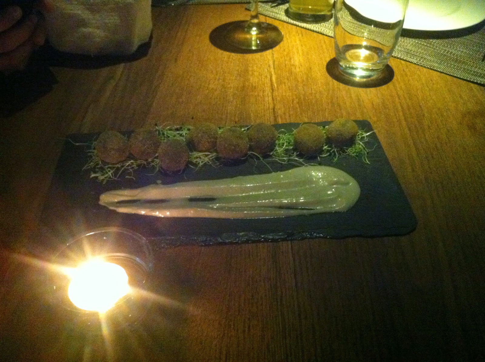 Comenzamos con un vino blanco (en el tema del drinking) y unas croquetas de chipirones en su tinta, la mar de apetecibles y en formato catering, es decir, entera en la boca sin mancharte al morderla.