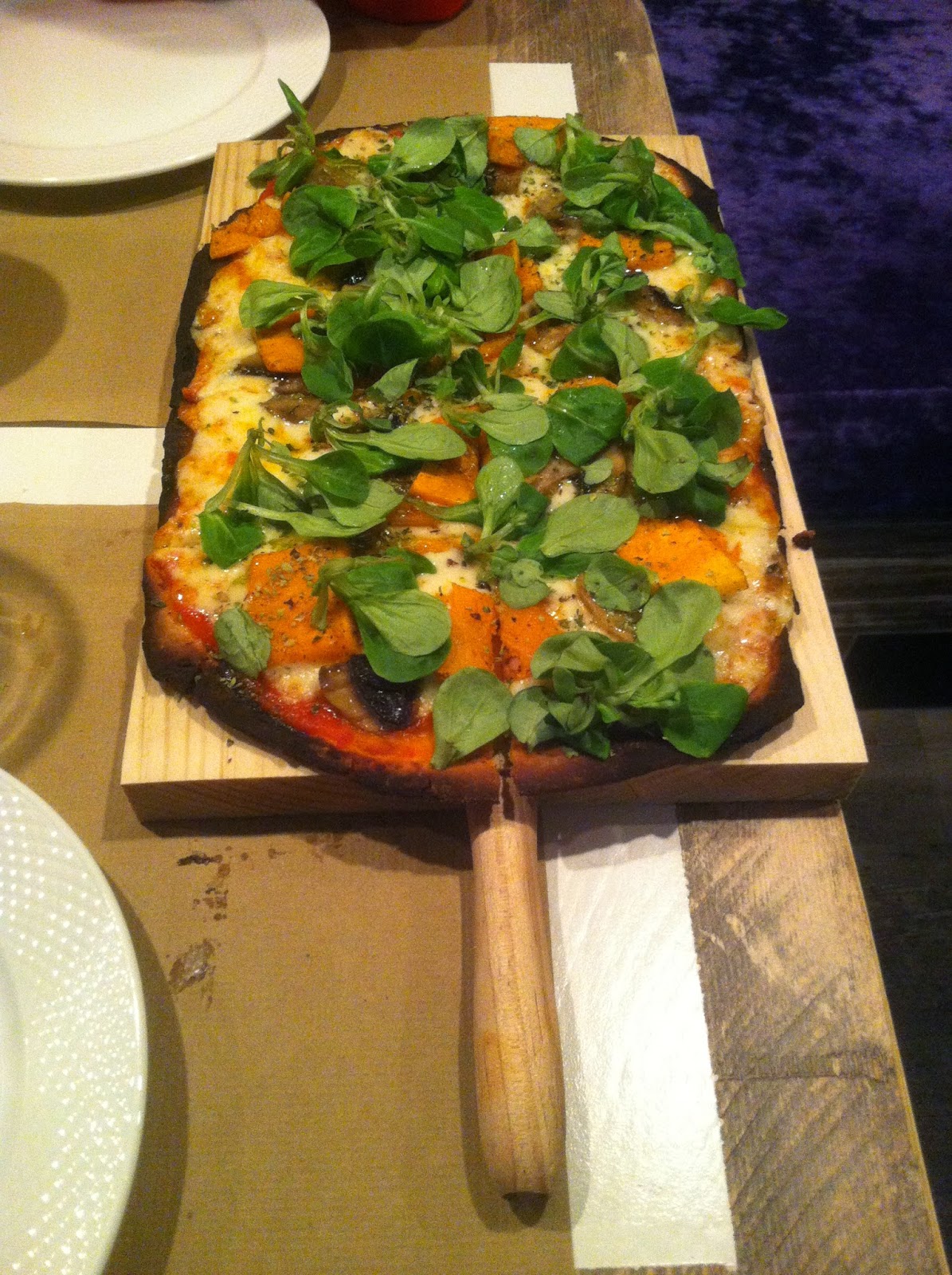 Una pizza de canónigos, calabaza, champiñón y trufa. Si tiene trufa, ya me habéis conquistado. Buena idea la forma de la pizza y esa tabla de cortar en la que viene, ¡bravo por la diferenciación en la restauración!