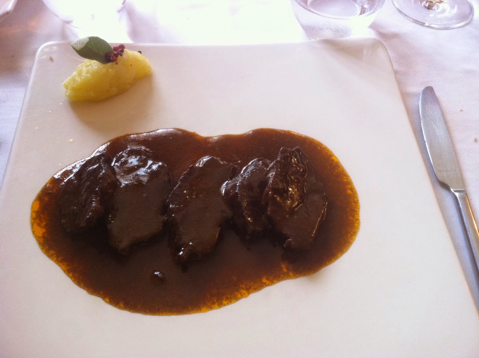 De segundo me pedí un plato contundente pero fácil de masticar, carrillera. Se deshacía en la boca, como si fuese mantequilla, y la salsa espesa y sabrosa. La manzana arriba a la izquierda me sobra, ya está muy vista, aparte lo de dulce salado...y menos si es una fruta.