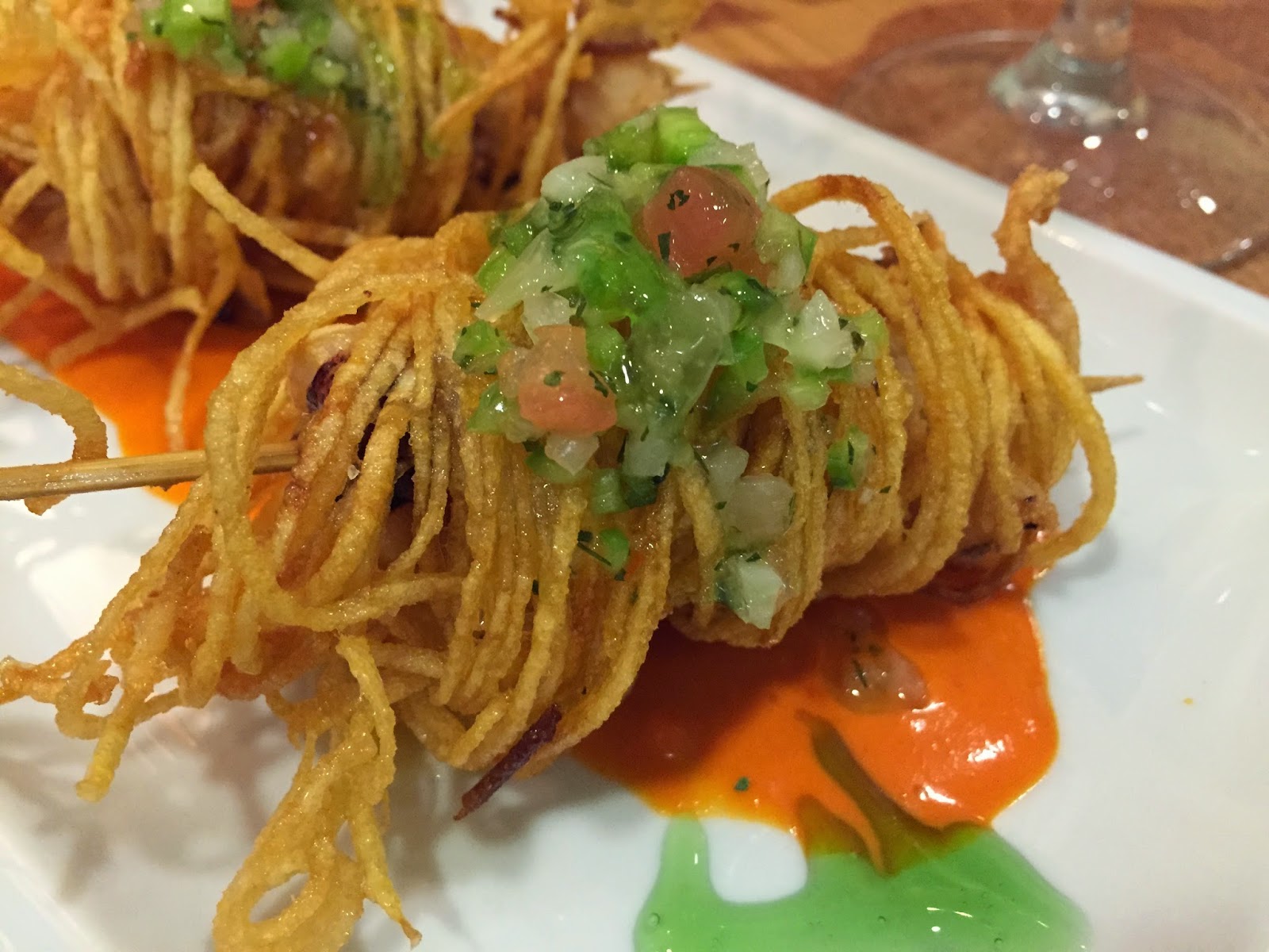 Por el módico precio de 1€ la tapa (habéis leido bien, ¡1€!), podréis disfrutar de un curioso sandwiche de pringá (reinterpretación del cocido), un espectacular zarajo de txipirón (para mi la tapa favorita), atún rojo, albóndigas con pasas, o esta sorprendente taza de chocolate con churros, ¡perdón! tortilla de patata con morcilla de Burgo, ¡toma ya!