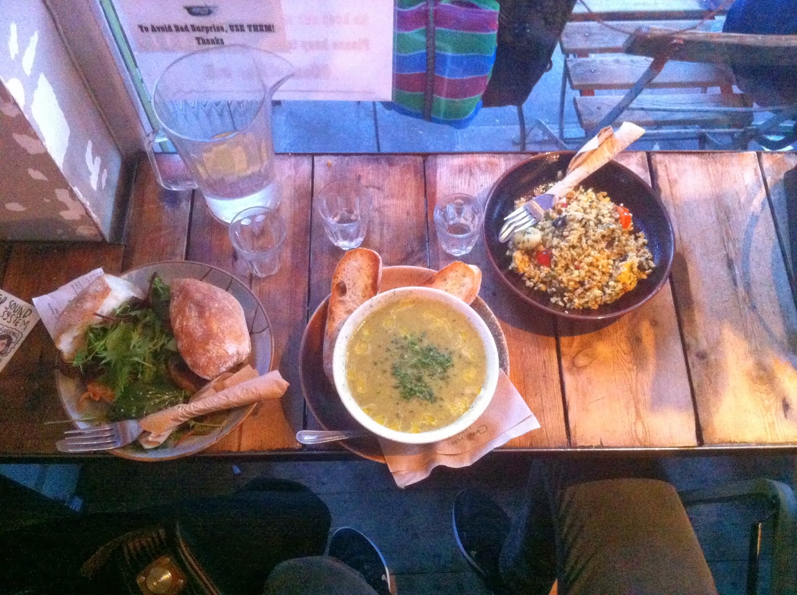 Cuscús, ensaladas, sandwiches, cremas o quinoa son platos que allí te puedes encontrar. El arroz no lo hacen bueno, y además les encanta servirlo frío, así que conmigo que no cuenten. Las cremas buenas, y las ensaladas diferentes, son tan guays que han vuelto a poner de moda la lechuga.