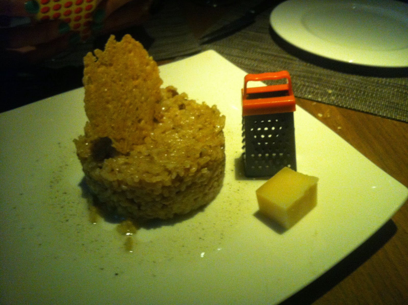Wok de verduras con gambón nada que objetar. Risotto de boletus con trufa y un curioso parmesano con mini-rallador, ¡otra cosa diferente! Rállate/cocínate este plato con un toque de queso. Me gusta que se empiece a potenciar los DIY (hazlo tú mismo en inglés), y que nos dejen meter un poco la mano en cocina.