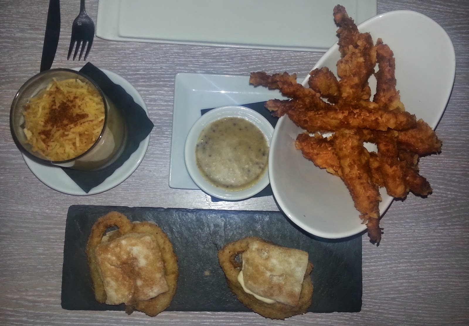 Continuando con el tema de compartir. Huevo trufado con patata y jamón...lo he probado en muchos sitios y me sigue enamorando, creo que voy a hacer un día una ruta para descubrir cual es el mejor. Bocatas de calamares con muy buen pan y buena fritura, y los fingerchips de pollo con salsa de mostaza y miel, perfectamente fritos y un buen rebozado de crispis aunque me falla la salsa, que cada vez me entusiasma menos, quizás por la miel.
