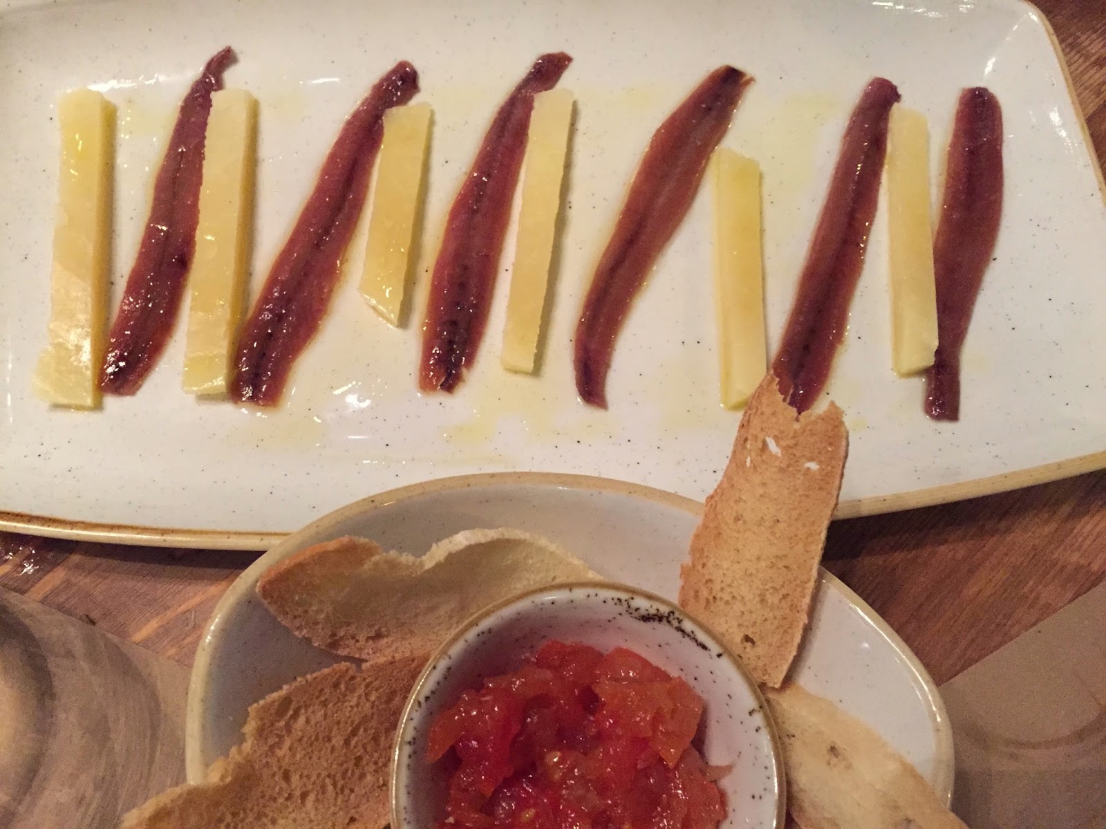 Y es que lo bueno de este restaurante te puede teletransportar en un momento a una tasca del Sardinero en Santander, con unas anchoas de Santoña sobre un queso curado de oveja (no es de Zamora de las ovejas de Félix, no todo podía ser perfecto) y acompañado de tomate y láminas de pan.