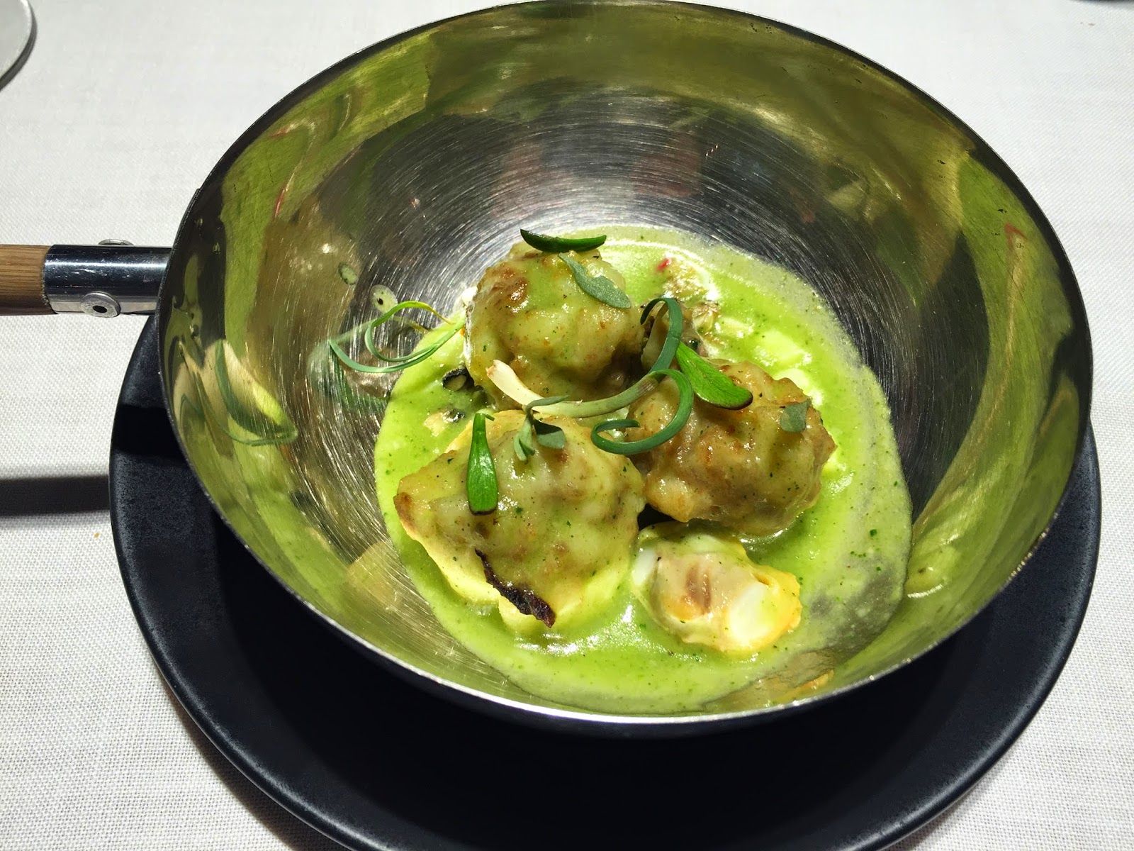 Y para acabar con los entrantes, canelón de cordero y repollo con bechamel de cacahuetes. Esa la cremosidad en estado puro, y mira que por dentro no se puede ver como está, pero imaginaros un jugoso cordero desmigado...así era.