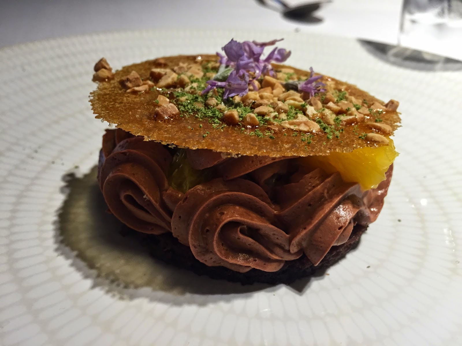 Para acabar con la función, mousse de chocolate con frutas encima y crujiente de caramelo con frutos secos. No sé si lo podéis apreciar pero eso naranja que asoma por debajo del caramelo es naranja. Bien por meter frutas, y bien por meter frutos secos de nuevo. Punto por vosotros.