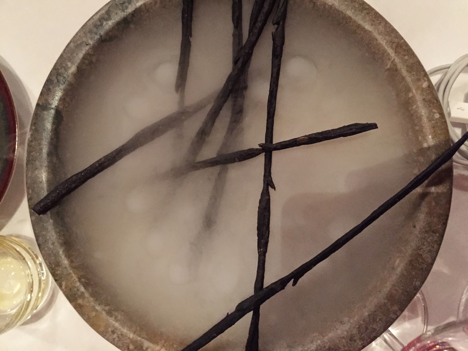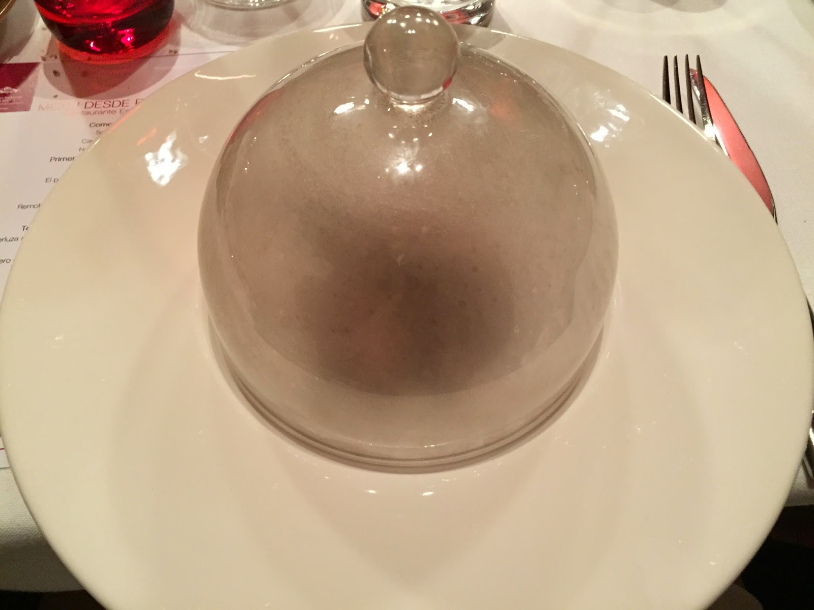 Otro plato sorprendente, hierba fresca. No se han vuelto locos y han cogido la bolsa del cortacésped y la han puesto sobre un precioso plato blanco, sino que sobre una crema de queso de oveja aparece foie-gras en polvo (brutal), polvo de hierba fresca (pero fresca fresca) y aire de leche de oveja ahumada. Un soplo de aire fresco, como dice el anuncia. Algo sorprendente, no sé, me sentía como en el colegio en la edad de la inocencia...¡todo me sorprende!